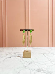 Aretes hoja larga dorados con piedra color verde.